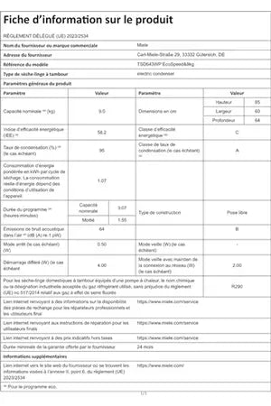 Classé A+++ en efficacité énergétique, le Mièle TSD643WP EcoSpeed consomme en moyenne 194 kWh par an.